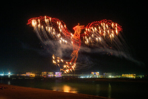 The Phoenix, representing the spirit of RAK, is a titan of the sky with a massive 362m wingspan and 430m long from head to tail. Glowing in hues of dawn and molten gold, it soared 1200m across the bay, triggering 300 pyro-drones programmed in quick succession to create the illusion of a continuous flame.
